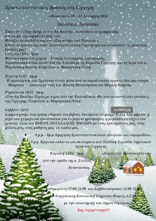 Η Κοινωνική Υπηρεσία του Δήμου Γόρτυνας και οι Φορείς της Δ.Ε. Ρούβα σας προσκαλούν, από την Τετάρτη 18 ως την Κυριακή 22 Δεκεμβρίου 2024, στις «Χριστουγεννιάτικες βραδιές στην Γέργερη» (θέση «Φουντάνα»). Το πρόγραμμα περιλαμβάνει δραστηριότητες και εκπλήξεις για μικρούς και μεγάλους, μουσικές εκδηλώσεις και παρουσιάσεις, ενώ στον χώρο θα λειτουργήσουν χριστουγεννιάτικη αγορά, το «Ταχυδρομείο του Άη Βασίλη», όπου τα παιδιά θα μπορούν να φωτογραφηθούν μαζί του και να στείλουν το γράμμα τους, αλλά και το «Εργαστήρι των Ξωτικών», με δράσεις κατασκευής χριστουγεννιάτικων στολιδιών. Ωράριο λειτουργίας: Καθημερινές 17:00 – 21:00, Σαββατοκύριακο 12:00 – 21:00.