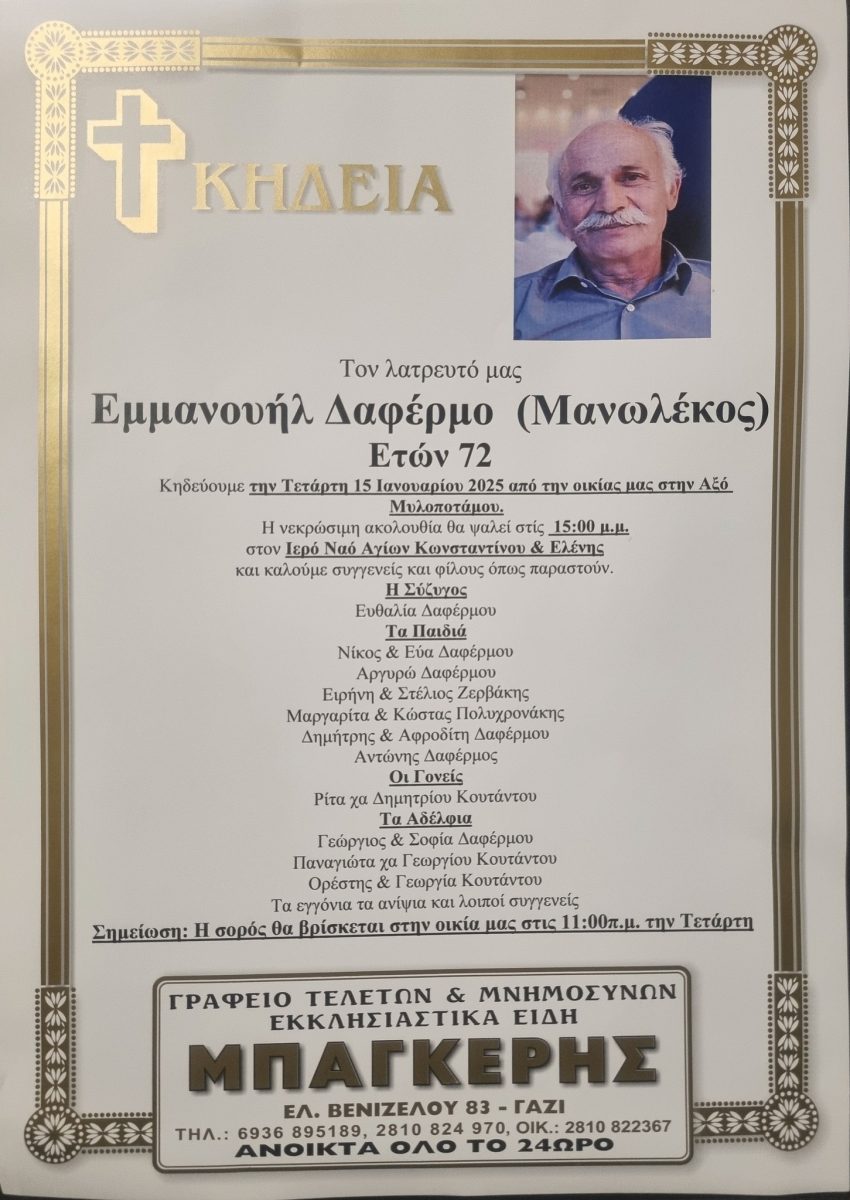 Έφυγε από τη ζωή ο Εμμανουήλ Δαφέρμος (Μανωλέκος) από την Αξό σε ηλικία 72 ετών.