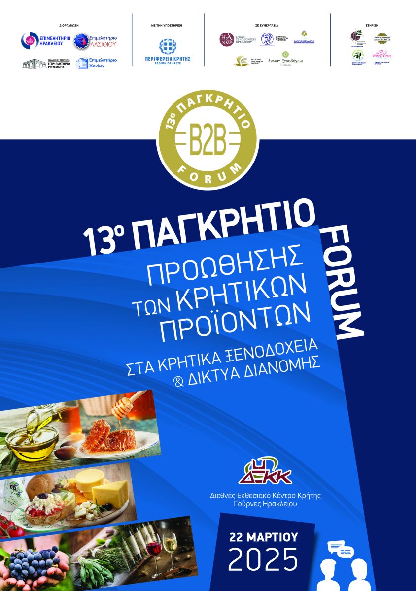 Το 13ο Παγκρήτιο Forum θα διεξαχθεί το Σάββατο 22 Μαρτίου 2025 στο ΔΙΕΘΝΕΣ ΕΚΘΕΣΙΑΚΟ ΚΕΝΤΡΟ ΚΡΗΤΗΣ (ΔΕΚΚ) στις Γούρνες Ηρακλείου με συμμετοχές απ’ όλη την Κρήτη. Θα περιλαμβάνει συναντήσεις για τη διάθεση φρέσκων και μεταποιημένων κρητικών αγροτικών προϊόντων στα κρητικά ξενοδοχεία και στην τοπική αγορά, μέσω των δικτύων διανομής – super market, καθώς και συναντήσεις με βιοτέχνες, μεταποιητές και άλλων προϊόντων που σχετίζονται με τον τουρισμό (πχ είδη συσκευασίας, καθαριστικά, εξοπλισμός κλπ), ώστε να δοθεί η ευκαιρία επέκτασης της συνεργασίας και με άλλους τομείς της τοπικής οικονομίας, πλην του αγροδιατροφικού.