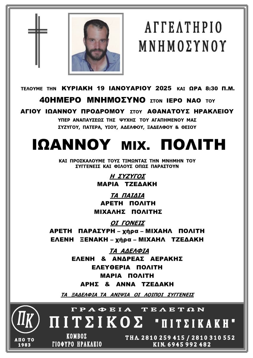 Την Κυριακή 19 Ιανουαρίου στις 8.30 το πρωί το 40ήμερο μνημόσυνο του Ιωάννη Πολίτη στους Αθανάτους στον ΙΝ Αγίου Πρόδρομου.