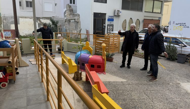 Εργασίες που πραγματοποιούνται από την Τεχνική Υπηρεσία του Δήμου Ηρακλείου για την κατασκευή ραμπών ΑμεΑ και προσβάσιμων χώρων υγιεινής σε παιδιά με αναπηρία παρακολούθησε από κοντά ο Δήμαρχος Ηρακλείου Αλέξης Καλοκαιρινός μαζί με τους Αντιδημάρχους Τεχνικών Υποδομών και Βιώσιμης Κινητικότητας Γιώργο Σισαμάκη και Παιδείας Αντώνη Περισυνάκη, το στέλεχος της Τεχνικής Υπηρεσίας Σοφία Αχλαδιανάκη και τον εργοδηγό Γιάννη Μπαστουνά.