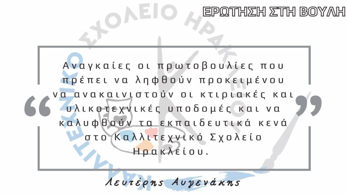 Στο πλαίσιο αυτό, ο Βουλευτής ΝΔ Ηρακλείου Λευτέρης Αυγενάκης κατέθεσε ερώτηση στη Βουλή προς τους Υπουργούς Παιδείας, Θρησκευμάτων και Αθλητισμού κ. Κυριάκο Πιερρακάκη, Υποδομών και Μεταφορών κ. Χρήστο Σταϊκούρα και Εσωτερικών κ. Θεόδωρο Λιβάνιο αναφορικά με την επίλυση κτιριακών, υλικοτεχνικών προβλημάτων στο Καλλιτεχνικό Σχολείο Ηρακλείου και την κάλυψη εκπαιδευτικών κενών.