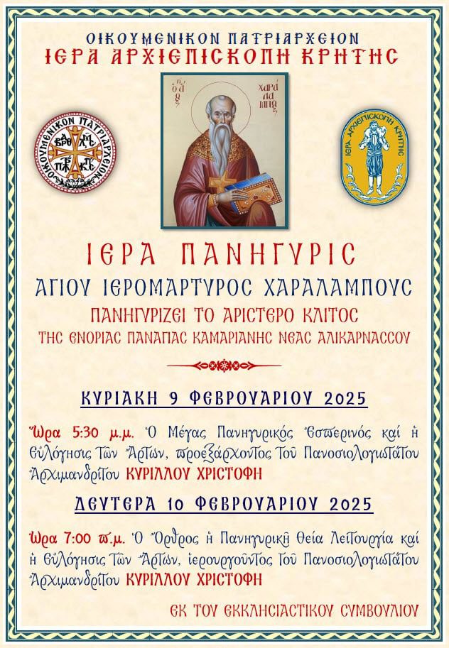 Πρόγραμμα Ιεράς Πανηγύρεως Αγίου Χαραλάμπους της Ενορίας Παναγίας Καμαριανής