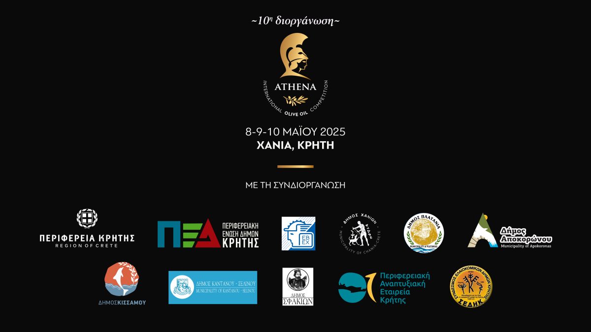 Τα Χανιά θα φιλοξενήσουν φέτος τον 10ο διεθνή διαγωνισμό ελαιόλαδου «Athena International Olive Oil Competition» (ATHENA IOOC), από τις 8 έως τις 10 Μαΐου 2025, με τη συνδιοργάνωση της Περιφέρειας Κρήτης, της Περιφερειακής Ένωσης Δήμων Κρήτης, του Εμπορικού και Βιομηχανικού Επιμελητηρίου Χανίων, του Δήμου Χανίων, του Δήμου Πλατανιά, του Δήμου Αποκρώνου, του Δήμου Κισσάμου, του Δήμου Καντάνου και Σελίνου, του Δήμου Σφακίων, της Περιφερειακής Αναπτυξιακής Εταιρείας Κρήτης και του Συνδέσμου Ελαιοκομικών Δήμων Κρήτης, όπως ανακοινώθηκε χθες 29.1.2025 στο πλαίσιο συνέντευξης τύπου που πραγματοποιήθηκε στο Κέντρο Αρχιτεκτονικής της Μεσογείου.