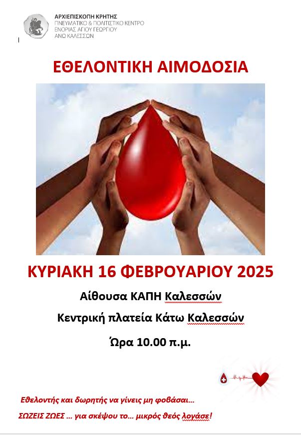 Το Πνευματικό Κέντρο Καλεσσών διοργανώνει Εθελοντική Αιμοδοσία στη αίθουσα του ΚΑΠΗ στα Κάτω Καλέσσα (στη κεντρική πλατεία) τη Κυριακή 16 Φεβρουαρίου 2025.