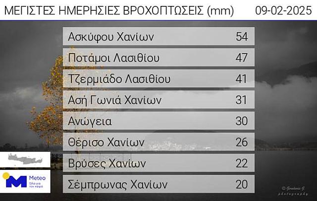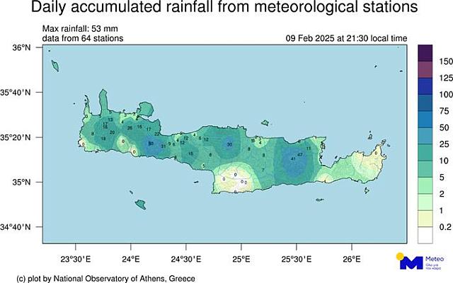 Σημειώνεται ότι στα νότια τμήματα του νησιού οι βροχές ήταν ελάχιστες έως μηδενικές.