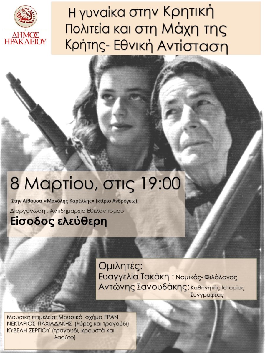 Μια ιδιαίτερη εκδήλωση για τη γυναίκα στα χρόνια της Κρητικής Πολιτείας, της Μάχης της Κρήτης και της Εθνικής Αντίστασης διοργανώνει, με αφορμή την Παγκόσμια Ημέρα της Γυναίκας, ο Δήμος Ηρακλείου και η Αντιδημαρχία Εθελοντισμού το Σάββατο 8 Μαρτίου στις 7 το απόγευμα στην αίθουσα «Μανόλης Καρέλλης» στο κτίριο της Ανδρόγεω.