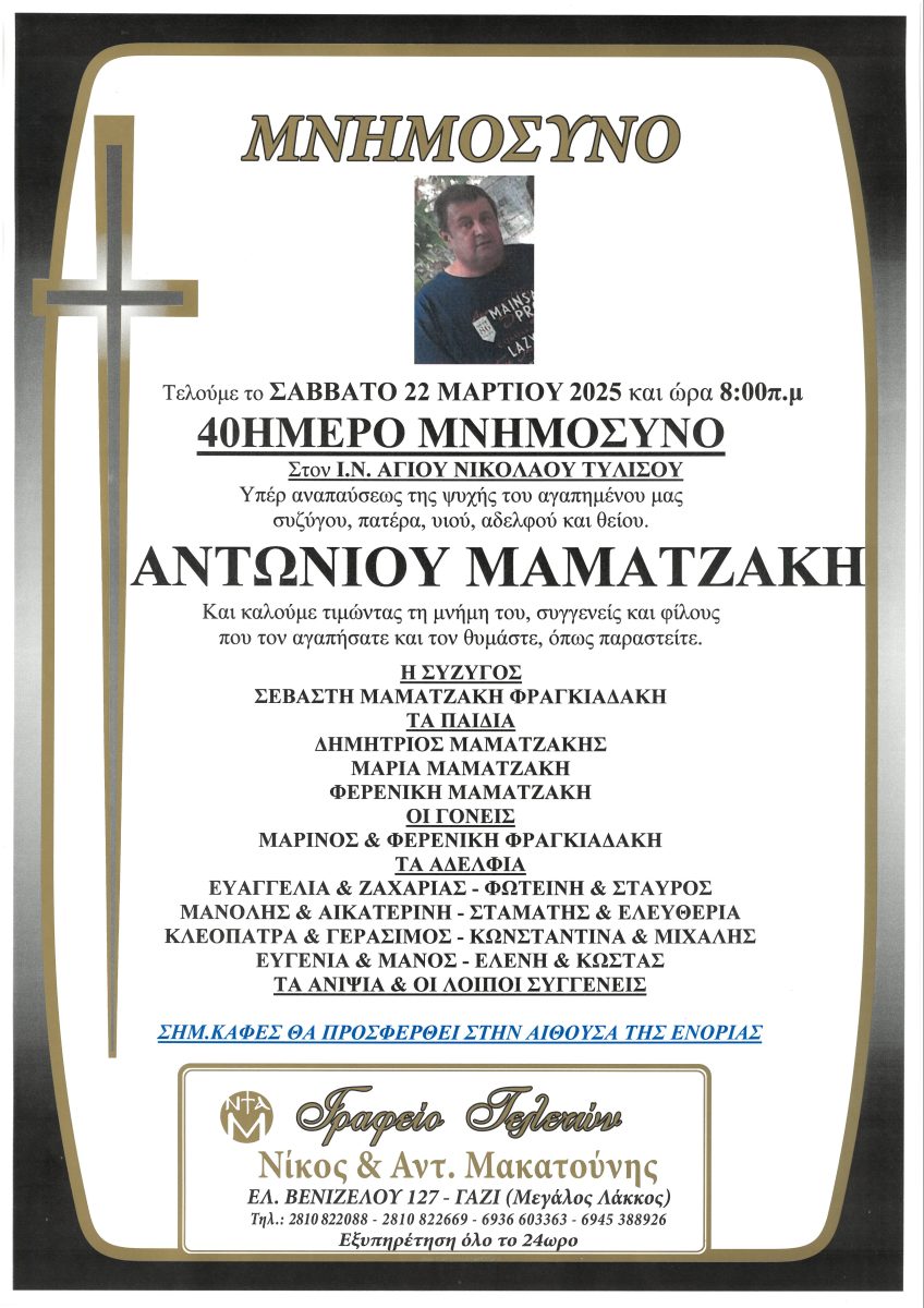 Το Σάββατο 22 Μαρτίου 2025 και ώρα 8,00 π.μ. θα τελεστεί το 40ήμερο μνημόσυνο του Αντώνη Μαματζάκη στον Ι.Ν. Αγίου Νικολάου στην Τύλισο