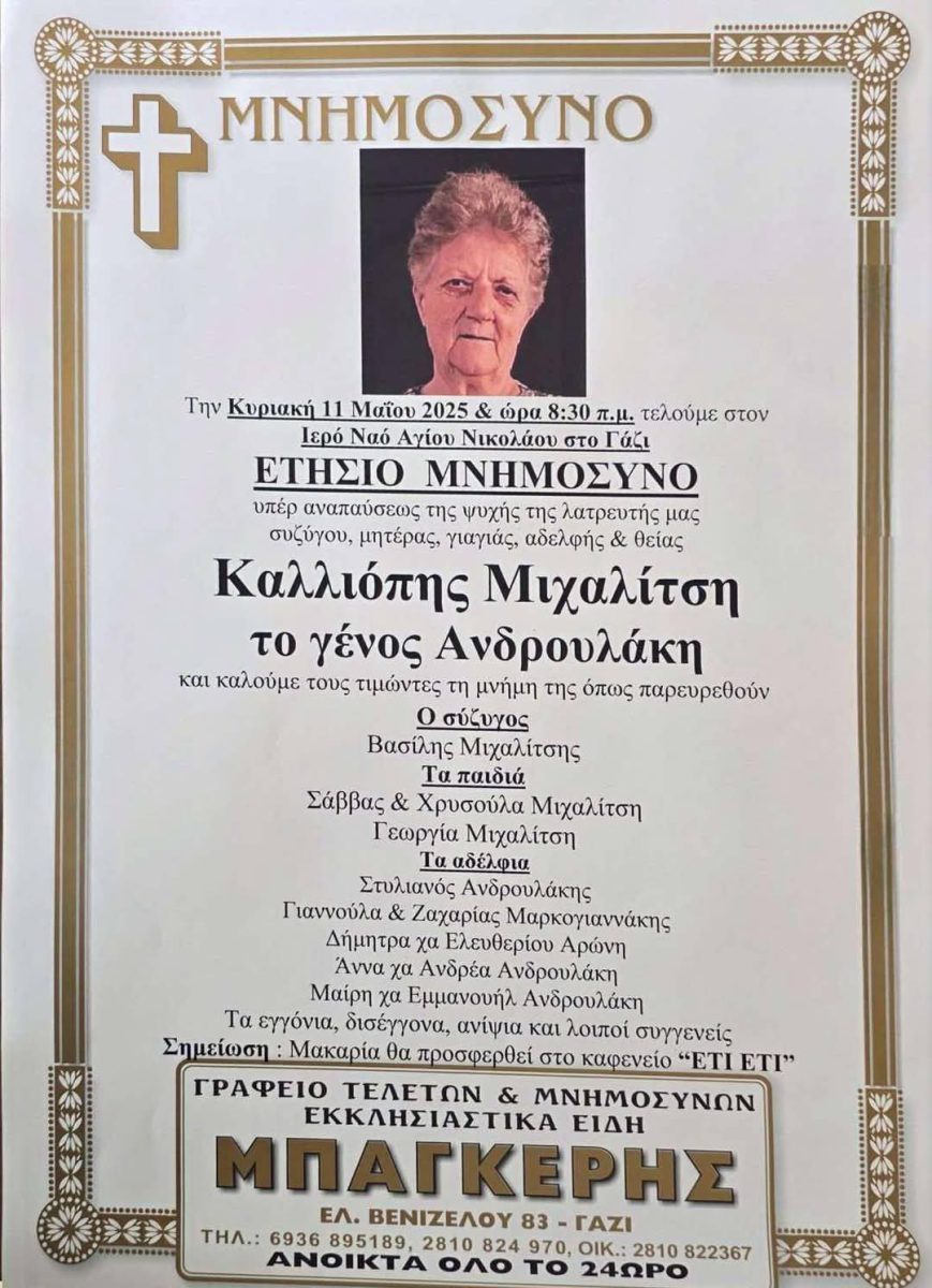 Πέρασε ένας χρόνος από το θάνατο της Καλλιόπης Μιχαλίτση και οι αγαπημένοι της άνθρωποι, ο σύζυγος Βασίλης και τα παιδιά Σάββας και Γεωργία θα τελέσουν μνημόσυνο την Κυριακή 11 Μαϊου στις 8.30 π.μ. στον Ι.Ν. Αγίου Νικολάου στο Γάζι.