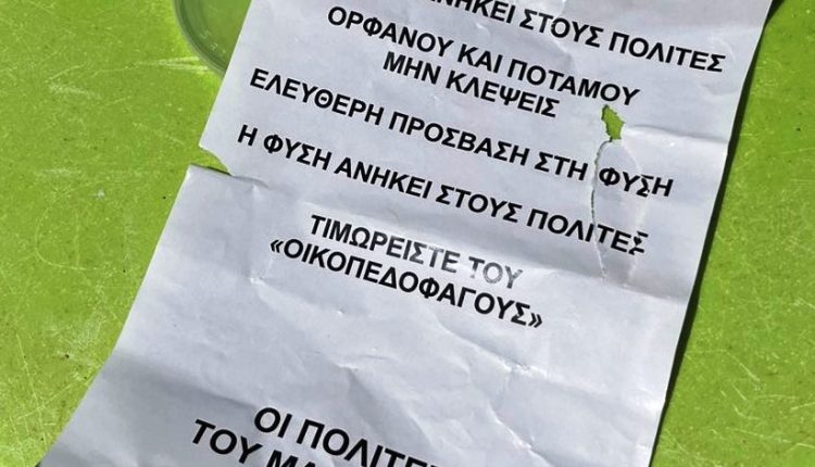 μεταλλική περίφραξη και άφησαν πίσω τους ένα σημείωμα με συνθήματα όπως “ΤΟ ΠΟΤΑΜΙ ΑΝΗΚΕΙ ΣΤΟΥΣ ΠΟΛΙΤΕΣ”, “ΟΡΦΑΝΟΥ ΚΑΙ ΠΟΤΑΜΟΥ ΜΗΝ ΚΛΕΨΕΙΣ”, “ΕΛΕΥΘΕΡΗ ΠΡΟΣΒΑΣΗ ΣΤΗΝ ΦΥΣΗ”, “Η ΦΥΣΗ ΑΝΗΚΕΙ ΣΤΟΥΣ ΠΟΛΙΤΕΣ” και “ΤΙΜΩΡΕΙΤΕ ΤΟΥΣ ‘ΟΙΚΟΠΕΔΟΦΑΓΟΥΣ'”.