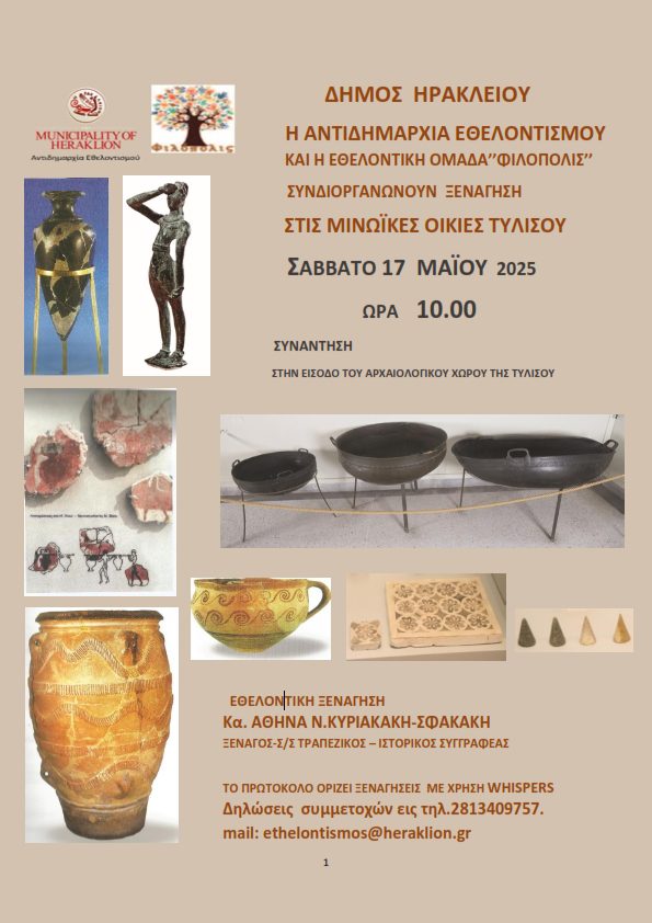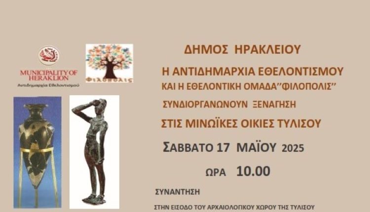 Στις μινωικές οικίες της Τυλίσου θα πραγματοποιηθεί το Σάββατο 17 Μαΐου η επόμενη ξενάγηση στο πλαίσιο του δεύτερου κύκλου των δωρεάν ξεναγήσεων που εγκαινίασε ο Δήμος Ηρακλείου και η Αντιδημαρχία Εθελοντισμού σε συνεργασία με την Ομάδα «Φιλόπολις» και την εθελοντική προσφορά της ξεναγού Αθηνάς Κυριακάκη- Σφακάκη.
