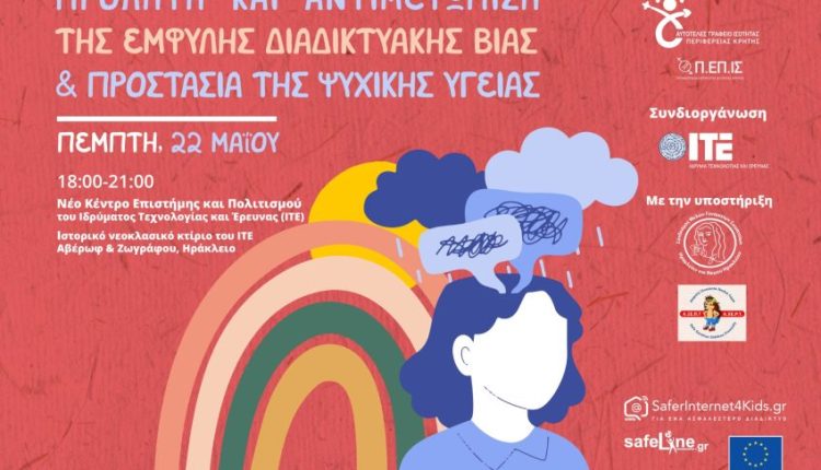 Με αφορμή τον μήνα ευαισθητοποίησης για την ψυχική υγεία η Περιφέρεια Κρήτης, Αυτοτελές Γραφείο Ισότητας και το Ίδρυμα Τεχνολογίας και Έρευνας (ΙΤΕ) συνδιοργανώνουν ενημερωτική εκδήλωση για την πρόληψη και αντιμετώπιση της διαδικτυακής βίας και την προστασία της ψυχικής υγείας παιδιών και εφήβων, την Πέμπτη 22 Μαΐου 2025, ώρα 6:00-9:00μ.μ., στο Κέντρο Επιστήμης και Πολιτισμού του ΙΤΕ, στο νεοκλασικό κτίριο στο κέντρο του Ηρακλείου (Αβέρωφ και Ζωγράφου). Η εκδήλωση θα πραγματοποιηθεί με την υποστήριξη του Συνδέσμου Μελών Γυναικείων Σωματείων Ηρακλείου και Ν. Ηρακλείου και της Α.ΞΕ.Π.Τ (Ασφαλή Ξένοιστα Παιδιά Τώρα).