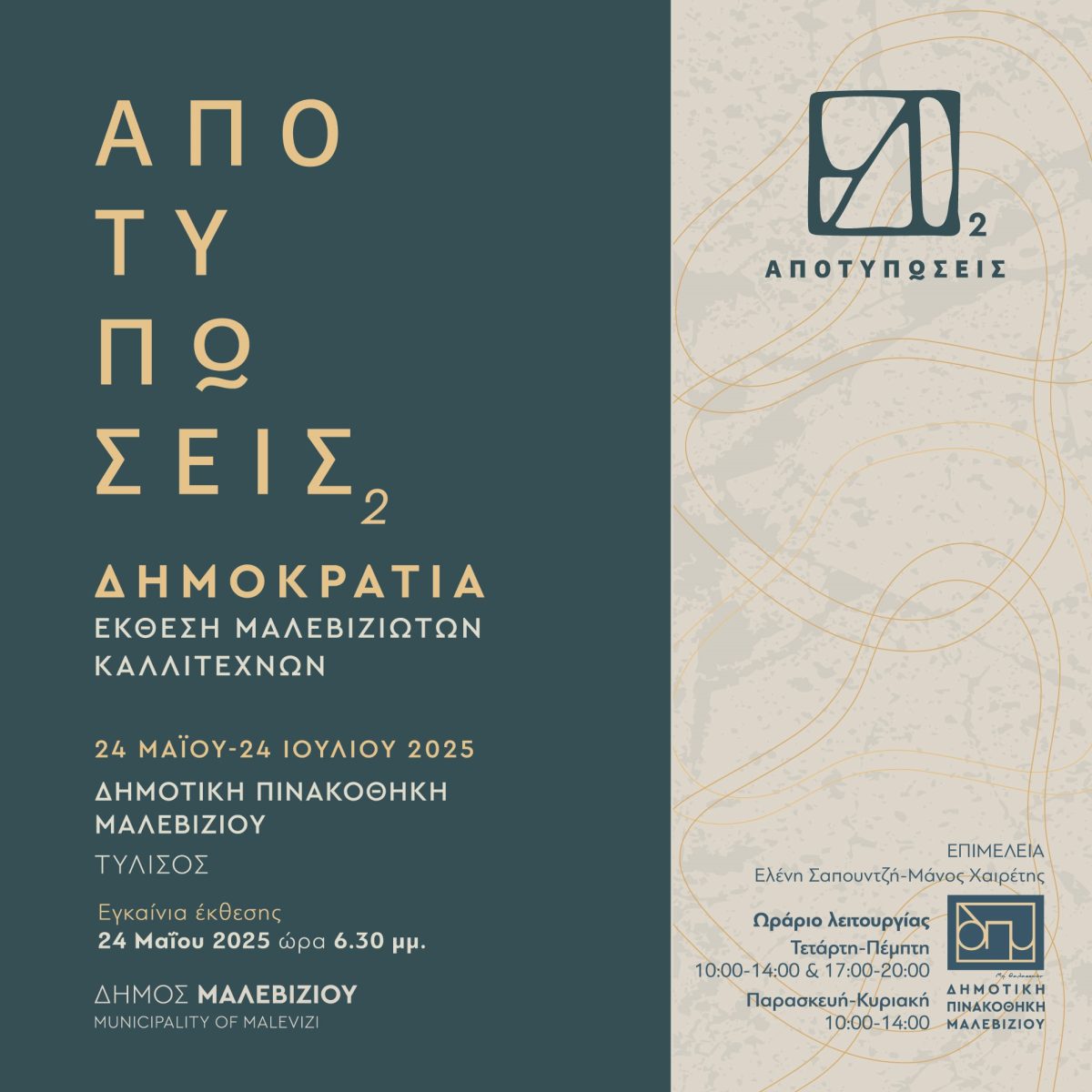 Δεκαοκτώ Μαλεβιζιώτες καλλιτέχνες συμμετέχουν με 38 έργα στη δεύτερη ομαδική εικαστική έκθεση «Αποτυπώσεις», που διοργανώνουν η Δημοτική Πινακοθήκη και ο Δήμος Μαλεβιζίου.