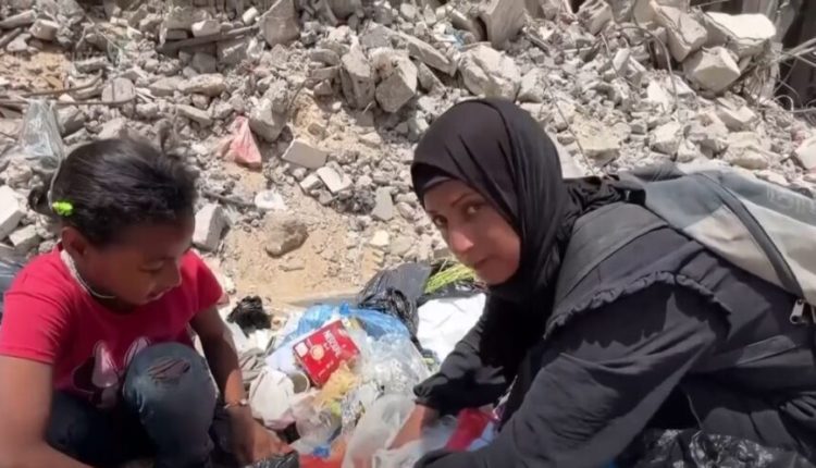 Με τις μύγες να βουίζουν γύρω τους, η γυναίκα και η κόρη της έψαχναν μέσα από ένα σωρό σακούλες σκουπιδιών για υπολείμματα φαγητού στους πρόποδες ενός κατεστραμμένου κτιρίου στην πόλη της Γάζας.