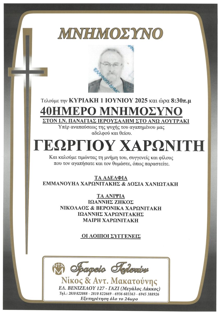 Την Κυριακή 1 Ιουνίου 2025 και ώρα 8,30 π.μ. θα τελεστεί το σαρανταήμερο μνημόσυνο του Γεωργίου Χαρωνίτη στον Ι.Ν. Παναγίας στο Άνω Λουτράκι