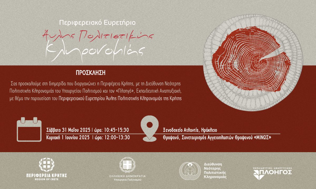 Η Περιφέρεια Κρήτης και η Διεύθυνση Νεότερης Πολιτιστικής Κληρονομιάς του Υπουργείου Πολιτισμού με ιδιαίτερη χαρά ανακοινώνουν τη δημιουργία του Περιφερειακού Ευρετηρίου Άυλης Πολιτιστικής Κληρονομιάς της Κρήτης. Το Περιφερειακό Ευρετήριο πρόκειται να παρουσιαστεί σε διημερίδα με τίτλο «Περιφερειακό Ευρετήριο Άυλης Πολιτιστικής Κληρονομιάς της Κρήτης: Παρουσίαση, Δυνατότητες και Προοπτικές». Οι εκδηλώσεις θα πραγματοποιηθούν το Σάββατο, 31 Μαΐου, στο Ηράκλειο και την Κυριακή, 1 Ιουνίου, στο Θραψανό Ηρακλείου.
