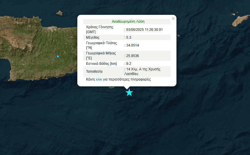 5,3 βαθμών της κλίμακας ρίχτερ ήταν ο σεισμός στην Κρήτη που έγινε στις 14.26 ‘ σύμφωνα με την αναθεωρημένη λύση του Γεωδυναμικού με το εστιακό βάθος στα 9. 2 χιλιόμετρα και επίκεντρο επίκεντρο 14 χλμ Α της Χρυσής.