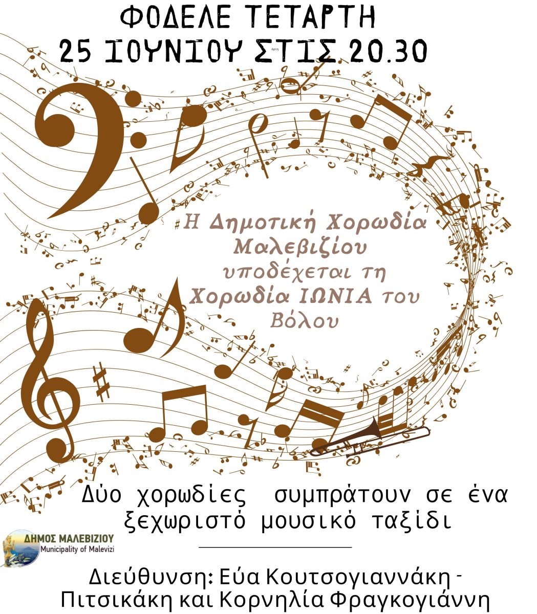 Ο Δήμος Μαλεβιζίου και η Δημοτική Χορωδία έχουν τη χαρά και την τιμή να φιλοξενούν τη φημισμένη Μικτή Χορωδία «Ιωνία» από το Βόλο, σε μια ιδιαίτερη μουσική βραδιά που θα πραγματοποιηθεί την Τρίτη 25 Ιουνίου και ώρα 20:30, στην κεντρική πλατεία του Φόδελε.