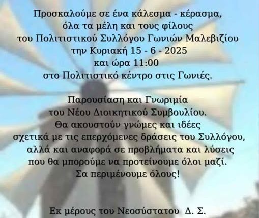 Ο Πολιτιστικός Σύλλογος Γωνιών Μαλεβιζίου, προσκαλεί, όλα τα μέλη και τους φίλους του, την Κυριακή 15 – 6 – 2025 και ώρα 11:00, στο Πολιτιστικό Κέντρο, στις Γωνιές, με σκοπό την παρουσίαση και γνωριμία του νέου Διοικητικού Συμβουλίου.