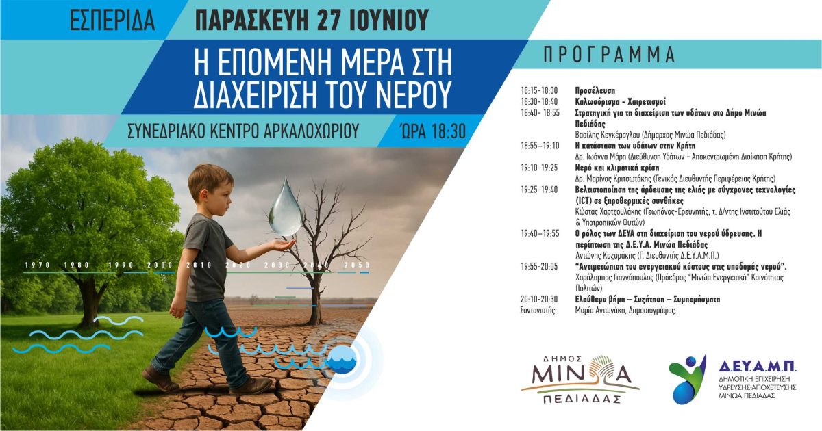Παράλληλα, στα πλαίσια της Έκθεσης, ο Δήμος Μινώα Πεδιάδας και η ΔΕΥΑΜΠ, διοργανώνουν εσπερίδα, με θέμα: “Η επόμενη μέρα στη διαχείριση του νερού”, την Παρασκευή 27 Ιουνίου, στις