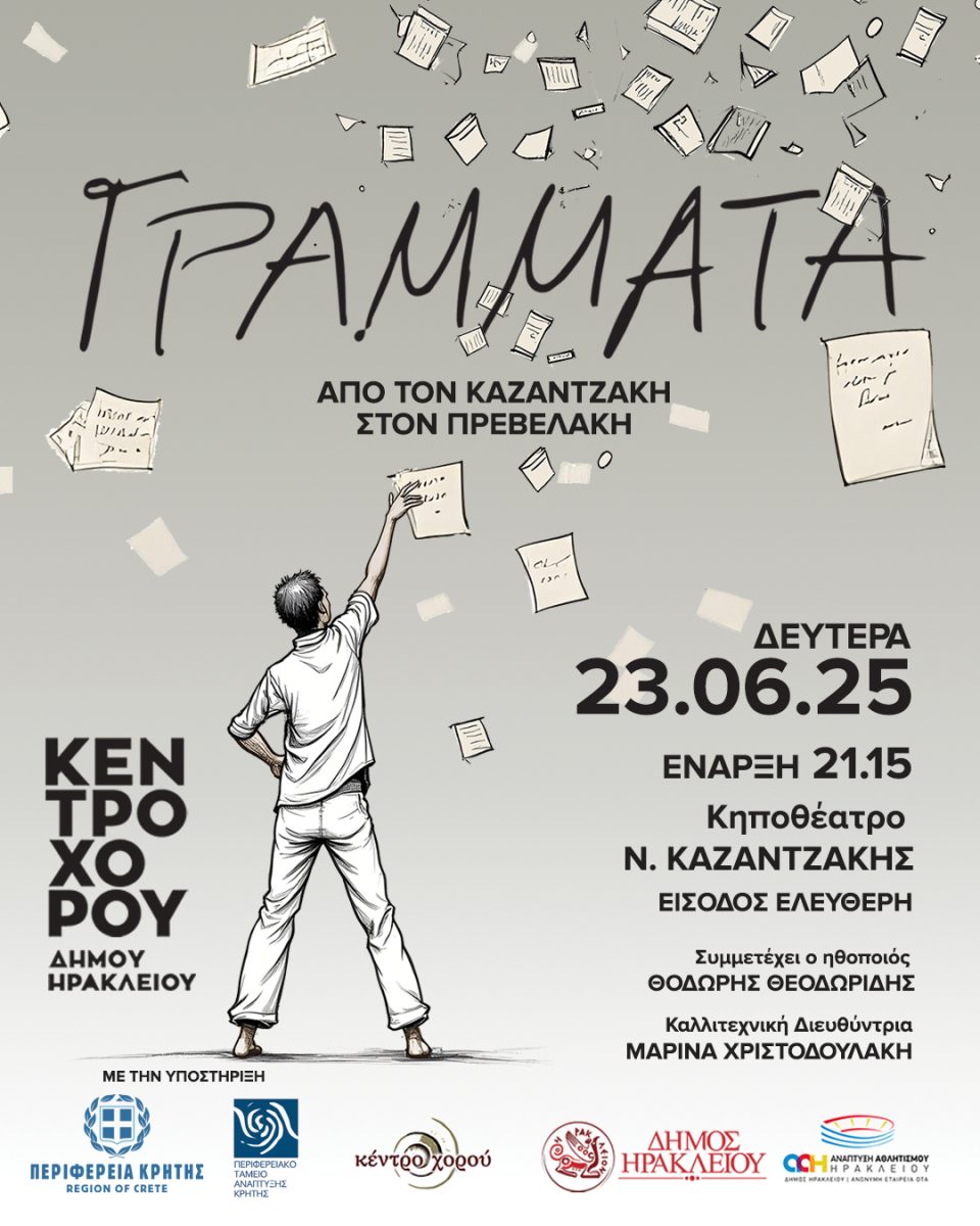 Τα «Γράμματα», την ετήσια παράσταση της δημοτικής σχολής χορού Ηρακλείου με ελεύθερη είσοδο για το κοινό, παρουσιάζουν οι μαθητές του Κέντρου Χορού και ο ηθοποιός Θοδωρής Θεοδωρίδης στο Κηποθέατρο «Νίκος Καζαντζάκης» με την υποστήριξη της Περιφέρειας Κρήτης τη Δευτέρα 23 Ιουνίου στις 21:30.