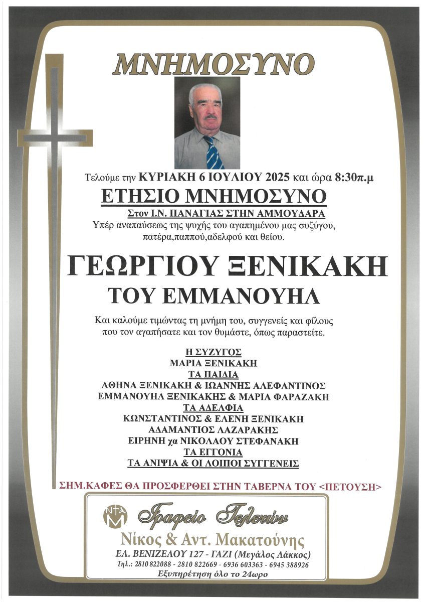 Την Κυριακή 6 Ιουλίου και ώρα 8:30 π.μ. θα τελεστεί το ετήσιο μνημόσυνο του Γεώργιου Ξενικάκη στον Ι.Ν. Παναγίας στην Αμμουδάρα.