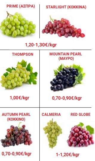 Για τις όψιμες ποικιλίες όπως η red globe & η calmeria οι τιμές υπολογίζεται πως θα διαμορφωθούν μεταξύ του 1-1,20€. Ο νομός Ηρακλείου διαθέτει επιπλέον όψιμες ποικιλίες όπως είναι τα Sweet globe & Sugar grisp (άσπρα) και τα Jack’s salute (κόκκινα). Αυτές οι ποικιλίες κόβονται το Φθινόπωρο και είναι αμερικάνικες ποικιλίες IFG.