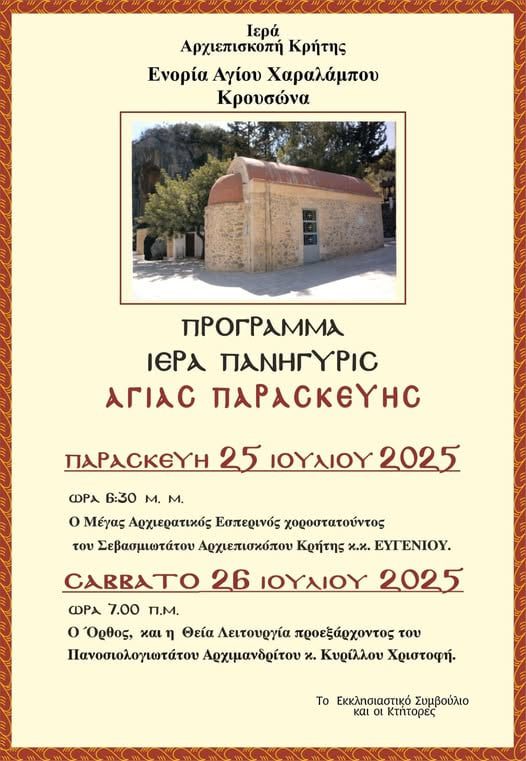 Με ιδιαίτερη λαμπρότητα θα εορταστεί και φέτος η μνήμη της Αγίας Παρασκευής στους Ιερούς Ναούς σε Κρουσώνα και Γάζι.