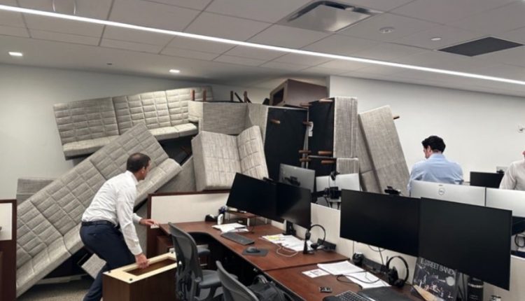 Όπως φαίνεται και στην εικόνα που ανέβηκε στο X, καναπέδες και πολυθρόνες φράσσουν την είσοδο των γραφείων της εταιρείας στην 345 Park Avenue, φτάνοντας ως το ταβάνι.