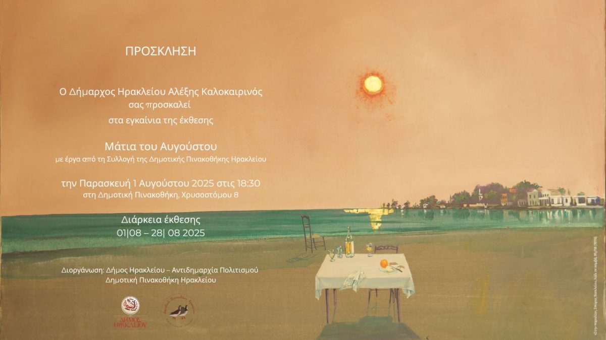 Με 60 έργα ζωγραφικής και χαρακτικής από την Συλλογή της, η Δημοτική Πινακοθήκη Ηρακλείου υποδέχεται τον Αύγουστο με μία θεματική έκθεση με τίτλο Μάτια του Αυγούστου. Την έκθεση θα εγκαινιάσει ο Δήμαρχος Ηρακλείου Αλέξης Καλοκαιρινός, σήμερα στις 18:30 το απόγευμα στον Πολυχώρο της Δημοτικής Πινακοθήκης Ηρακλείου (Χρυσοστόμου 8).