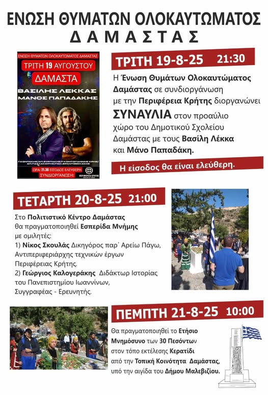 Το Δ.Σ. της Ένωσης Θυμάτων Ολοκαυτώματος Δαμάστας με αφορμή την επέτειο για τα 81 χρόνια από το ολοκαύτωμα της Δαμάστας και την εκτέλεση των 30 Εθνομαρτύρων διοργανώνει σειρά εκδηλώσεων για να τιμήσει τη μνήμη τους.
