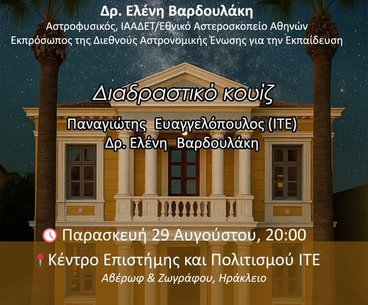 Διαδραστικό κουίζ με τους Παναγιώτη Ευαγγελόπουλο (ΙΑ-ΙΤΕ) και Ελένη Βαρδουλάκη – μια ευκαιρία να δοκιμάσετε τις γνώσεις σας στην Αστρονομία με τρόπο διασκεδαστικό και εκπαιδευτικό!