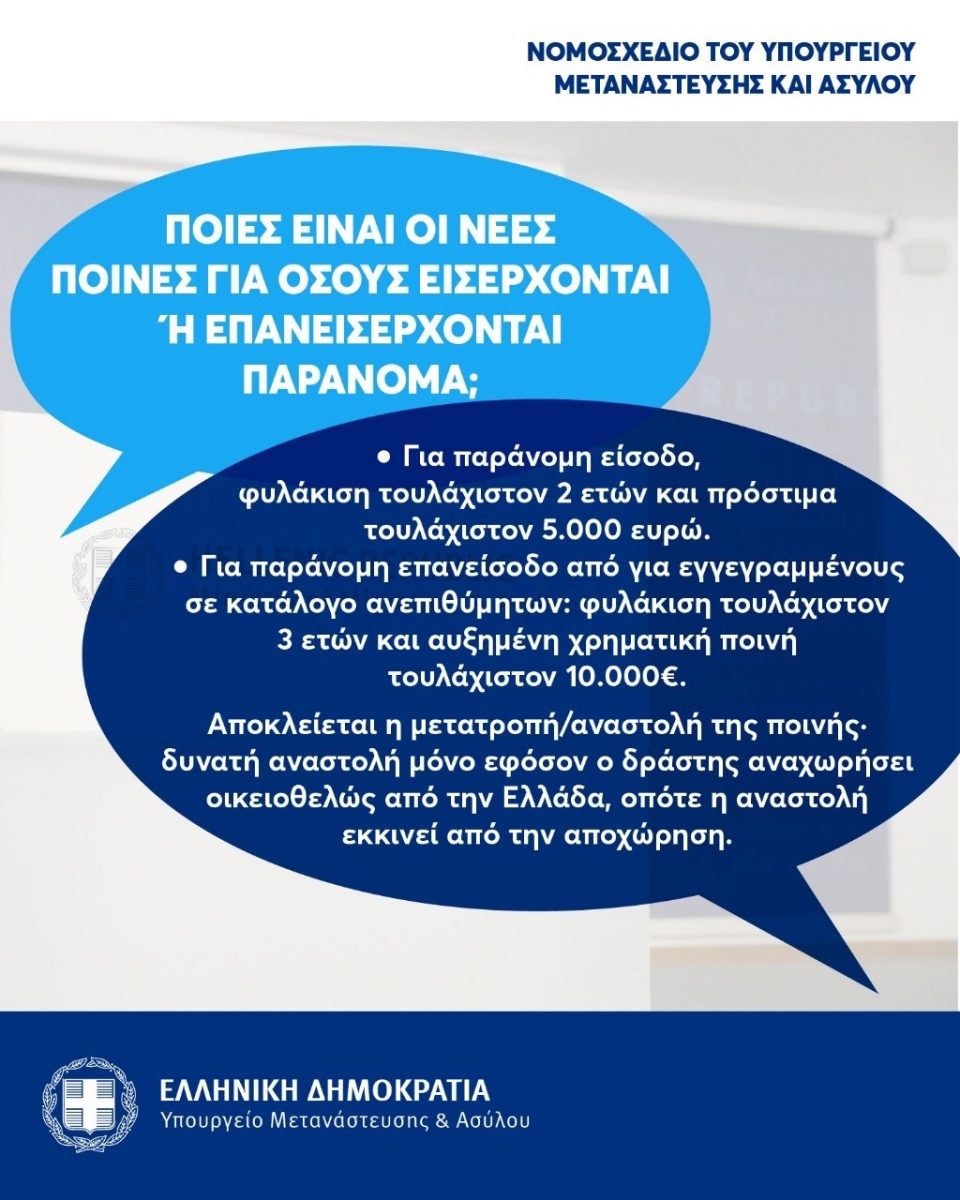 Με το νέο πλαίσιο εισάγεται η ποινικοποίηση της παράνομης παραμονής στη χώρα με ποινή φυλάκισης 2 έως 5 έτη και ελάχιστο πρόστιμο 5.000 ευρώ και παράλληλα καταργείται η δυνατότητα νομιμοποίησης μέσω μακροχρόνιας παράνομης διαμονής 7 ετών και περιορίζονται οι μεταγενέστερες αιτήσεις διεθνούς προστασίας, με στόχο την αποτροπή καταχρηστικών πρακτικών.