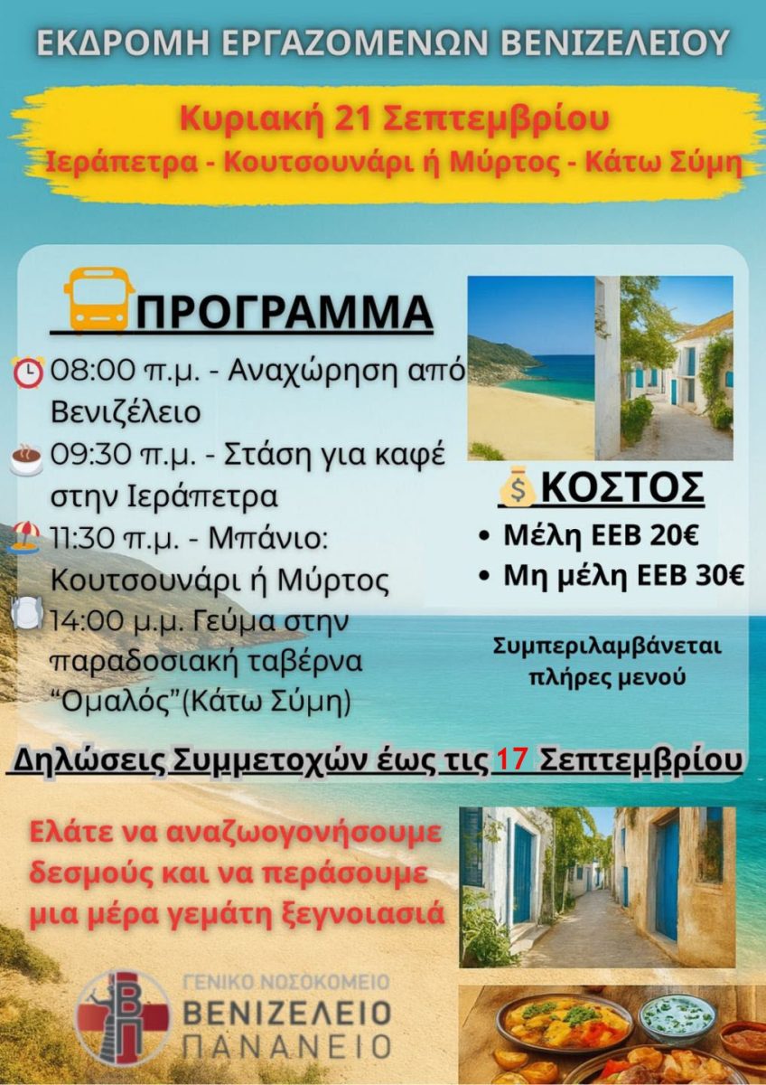 Η Ένωση Εργαζομένων Βενιζελείου με ιδιαίτερη χαρά προσκαλεί όλους τους εργαζόμενους του Νοσοκομείου σε εκδρομή που θα πραγματοποιηθεί την Κυριακή 21 Σεπτεμβρίου στην ευρύτερη περιοχή της Ιεράπετρας.