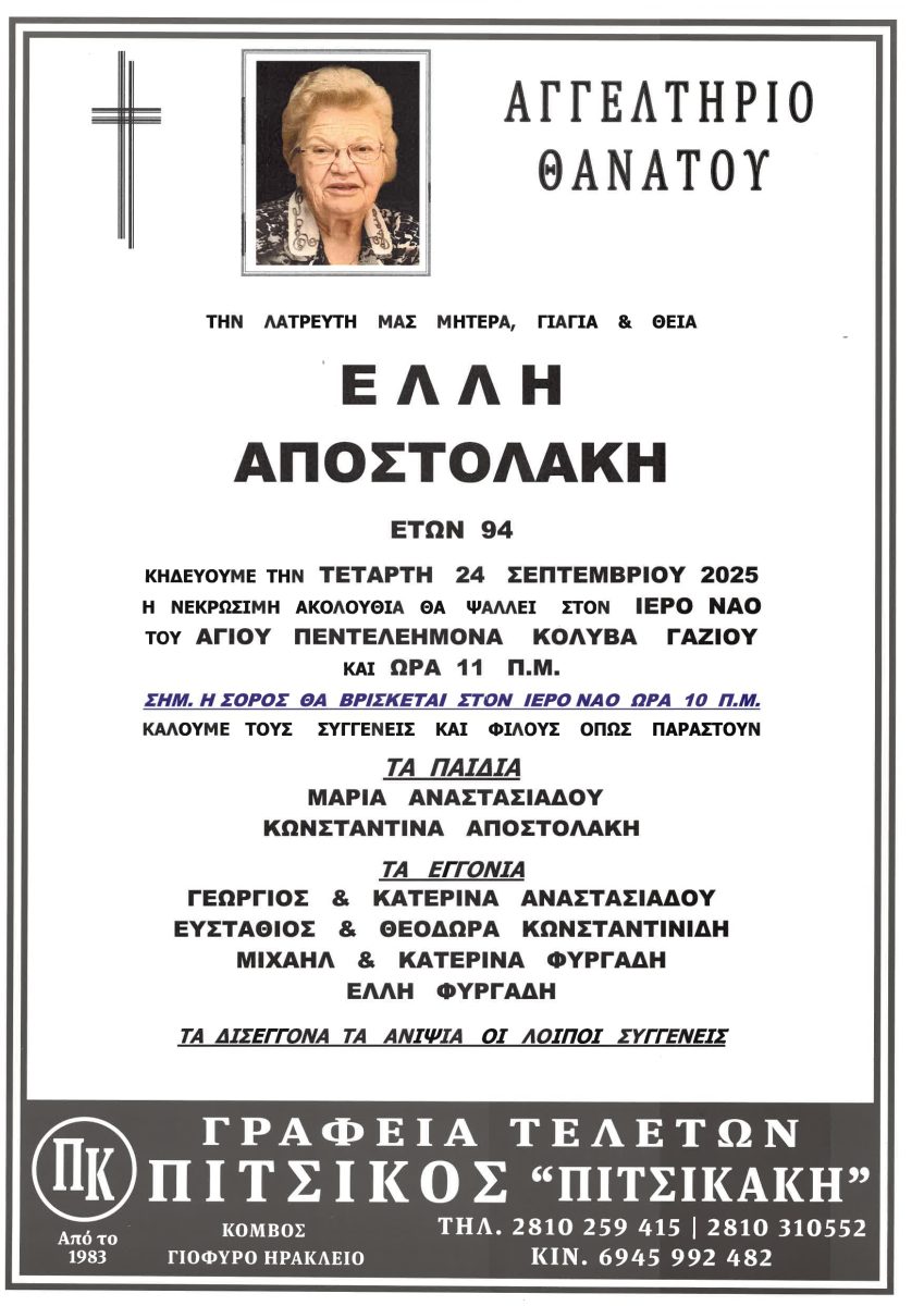 Έφυγε από τη ζωή η Έλλη Αποστολάκη από τον Κολυβά Γαζίου σε ηλικία 94 ετών.