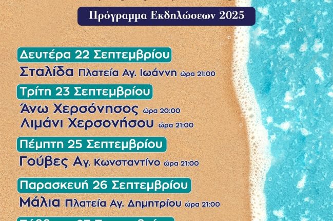 - Τρίτη 23 Σεπτεμβρίου – Άνω Χερσόνησος, ώρα 20:00 & Λιμάνι Χερσονήσου, ώρα 21:00.