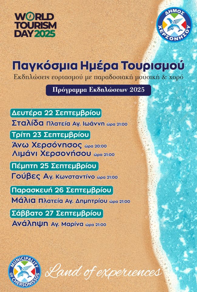 Ο Δήμος Χερσονήσου και η Αντιδημαρχία Τουρισμού, με αφορμή την Παγκόσμια Ημέρα Τουρισμού, διοργανώνουν για ακόμη μία χρονιά ένα πλούσιο πρόγραμμα εκδηλώσεων από τις 22 έως τις 27 Σεπτεμβρίου 2025, με στόχο την ανάδειξη της πολιτιστικής ταυτότητας της περιοχής και την ενίσχυση της σχέσης μεταξύ επισκεπτών και τοπικής κοινότητας. Οι εκδηλώσεις περιλαμβάνουν παραδοσιακή μουσική, χορό κι αυθεντικές εμπειρίες φιλοξενίας, προσφέροντας στους επισκέπτες και κατοίκους την ευκαιρία να γνωρίσουν τον πλούτο της κρητικής κουλτούρας μέσα από αυθεντικές στιγμές.