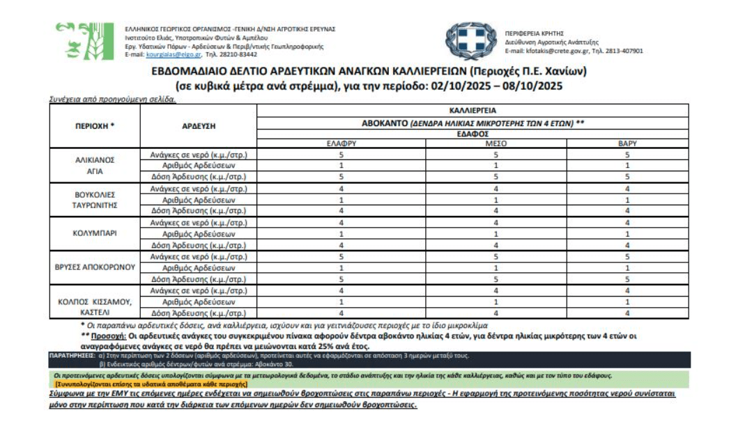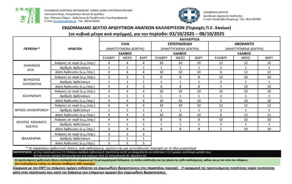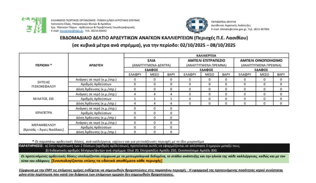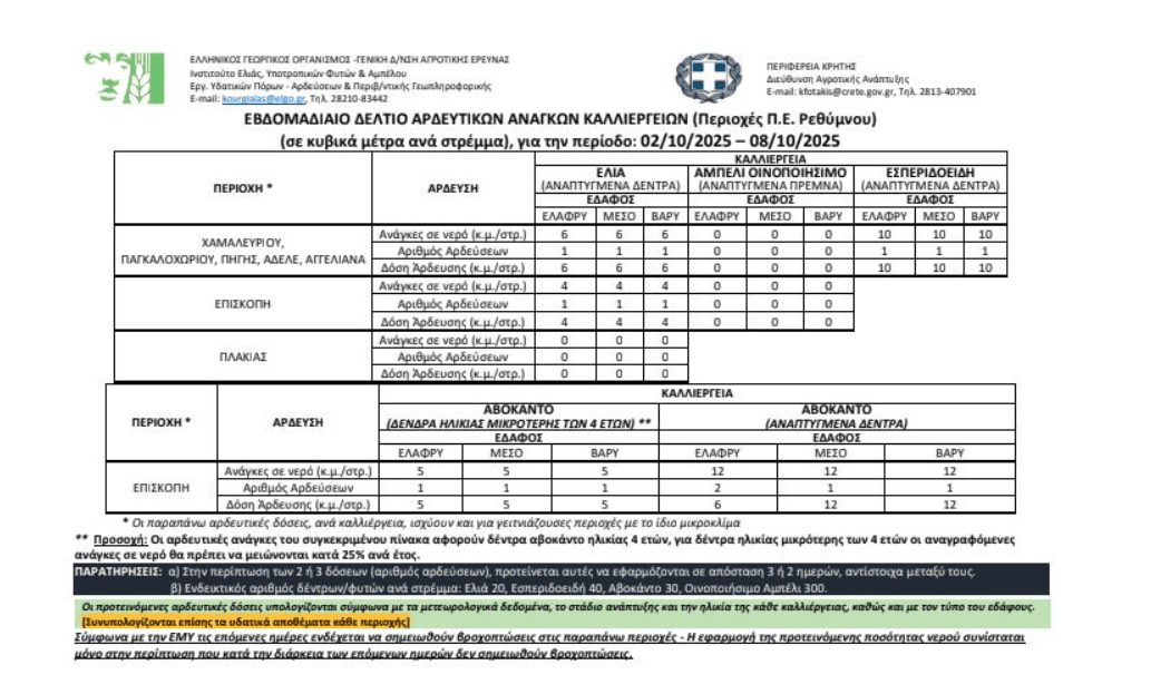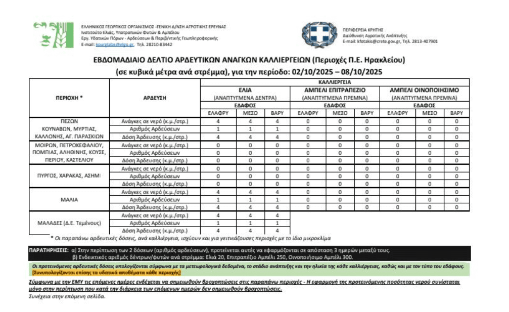 Η Περιφέρεια Κρήτης σε συνεργασία με το Ινστιτούτο Ελιάς Υποτροπικών Φυτών & Αμπέλου του ΕΛΓΟ-ΔΗΜΗΤΡΑ ανακοινώνει το 20ο Δελτίο άρδευσης για την περίοδο: 02/10/2025 – 08/10/2025