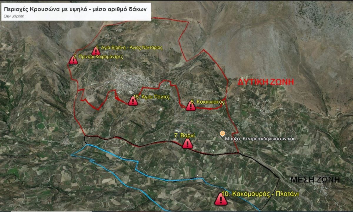 Σημειώνεται πως στην δυτική ζώνη φυτοπροστασίας στην περιοχή του Κρουσώνα στο ύψος του μοναστηριού της Αγίας Ειρήνης οι πληθυσμοί του δάκου εμφανίζουν αύξηση.