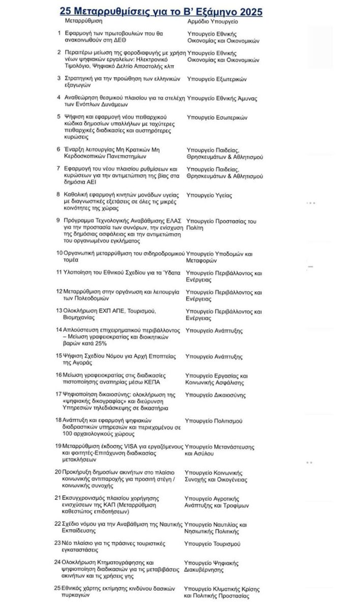 Επιπλέον, από τον Ιούλιο και μετά οι σημαντικότερες από τις 25 μεταρρυθμίσεις που προωθήθηκαν είναι: