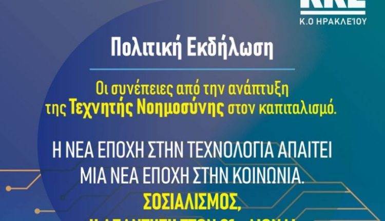 Η Τομεακή Επιτροπή Ηρακλείου του ΚΚΕ διοργανώνει Πολιτική Εκδήλωση το Σάββατο 11 Οκτωβρίου, ώρα 7:00μμ, στο Αμφιθέατρο Γ’ του ΕΛΜΕΠΑ με θέμα : «Οι συνέπειες από την ανάπτυξη της Τεχνητής Νοημοσύνης στον καπιταλισμό. Η νέα εποχή στην Τεχνολογία απαιτεί μία νέα εποχή στην κοινωνία. Σοσιαλισμός, η απάντηση στον 21ο αιώνα!».