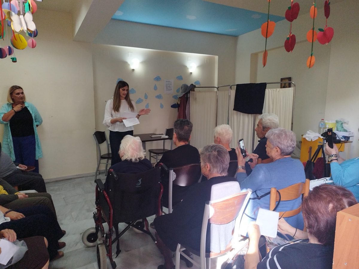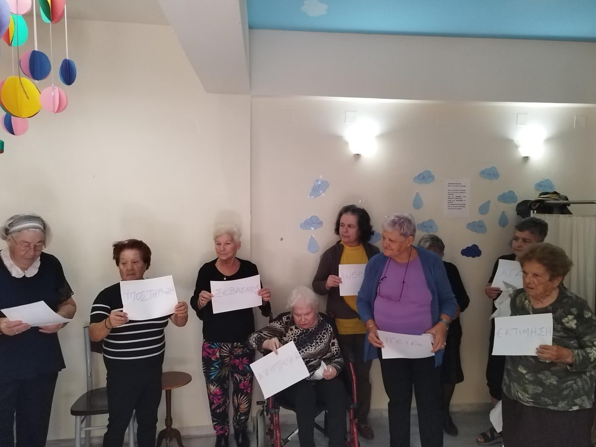 Οι ωφελούμενοι του Κέντρου δοκίμασαν τις ικανότητές τους στην υποκριτική και με την καθοδήγηση του προσωπικού ετοίμασαν θεατρική παράσταση με μικρά αποσπάσματα από ελληνικές ταινίες όπως η «Παριζιάνα» , οι «Γαμπροί της Ευτυχίας», «Δεσποινίς Διευθυντής» και «Χτυποκάρδια στο θρανίο». Στη συνέχεια τραγούδησαν όλοι μαζί, πέρασαν τα δικά τους μηνύματα για την Τρίτη Ηλικία, γεύτηκαν απολαυστικά εδέσματα και αντάλλαξαν αναμνηστικά δώρα.