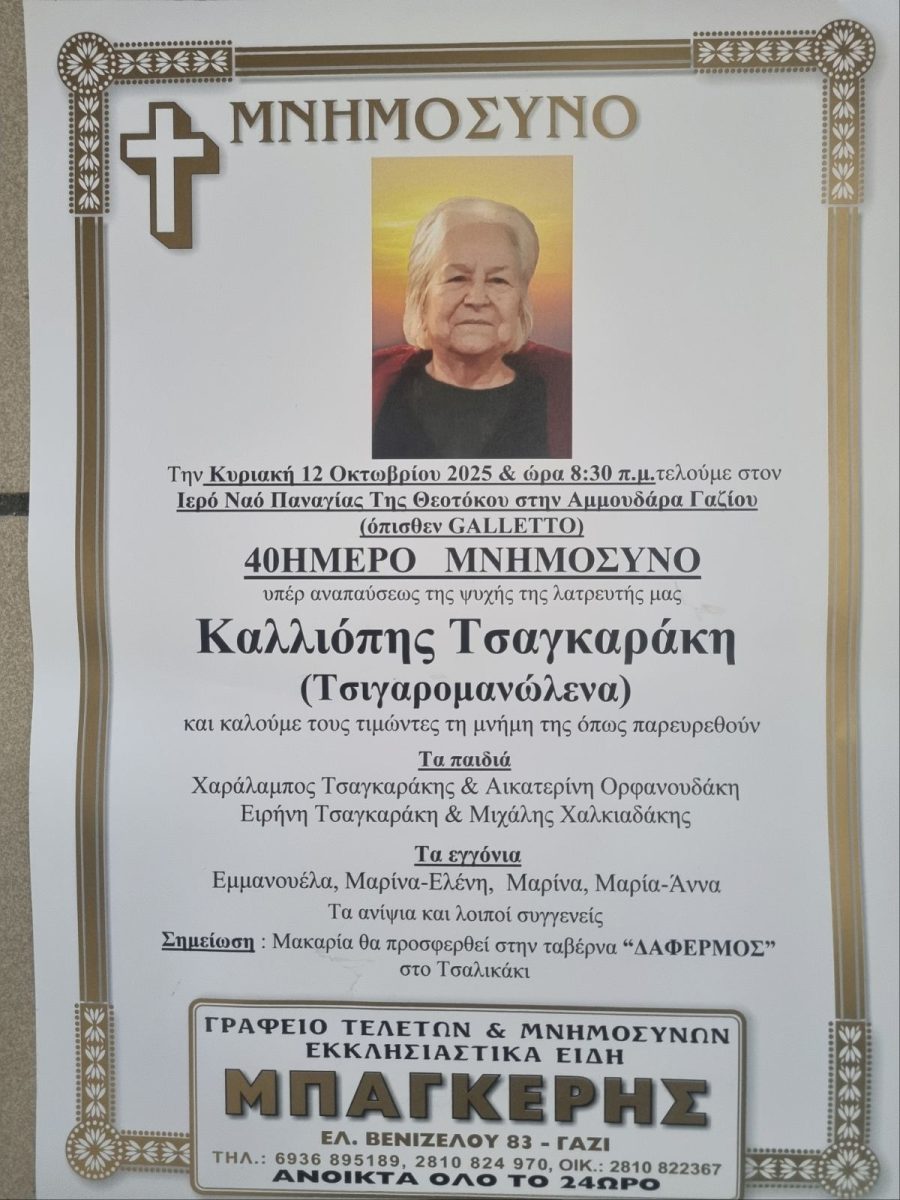 Την Κυριακή 12 Οκτωβρίου στις 8.30 π.μ. στον Ι.Ν. Παναγίας Της Θεοτόκου στην Αμμουδάρα Γαζίου (όπισθεν GALLETTO) θα τελεστεί το 40ήμερο μνημόσυνο της Καλλιόπης Τσαγκαράκη (Τσιγαρομανώλενα).