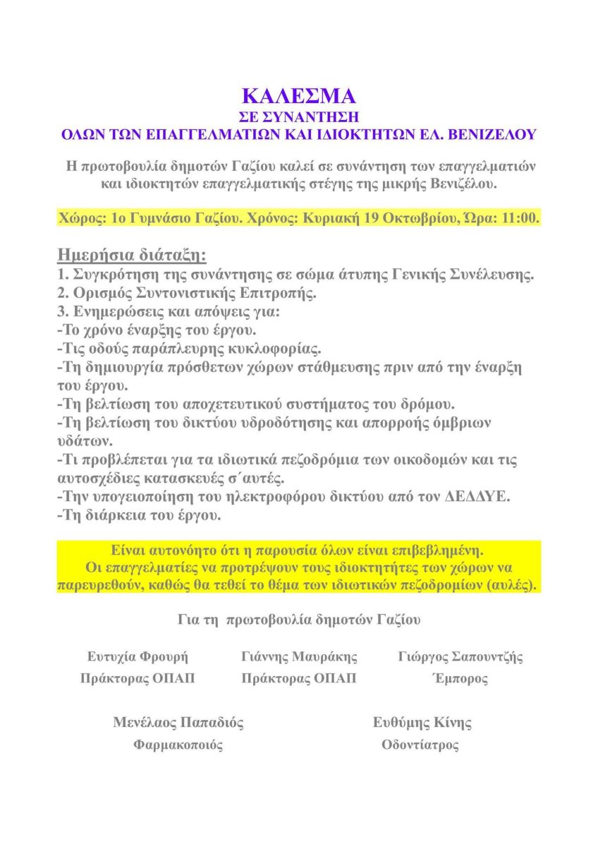 Ενημερωτική συνάντηση πολιτών με επαγγελματική στέγη για το έργο της ανάπλασης της Ελευθ. Βενιζέλου στο Γάζι, προγραμματίστηκε για την Κυριακή 19 Οκτωβρίου στις 11.00 π.μ. στο χώρο του Γυμνασίου Γαζίου.