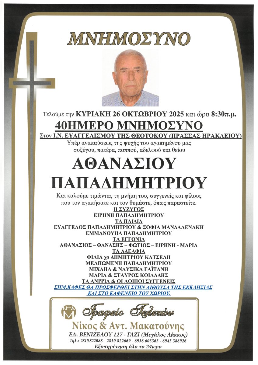 Την Κυριακή 26 Οκτωβρίου 2025 και ώρα 8:30 π.μ. το μνημόσυνο του Αθανασίου Παπαδημητρίου στον Ι.Ν. Ευαγγελισμού (Πρασσάς Ηρακλείο).
