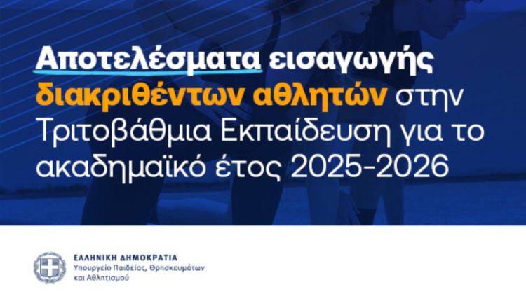 Από το Υπουργείο Παιδείας, Θρησκευμάτων και Αθλητισμού ανακοινώνονται σήμερα τα αποτελέσματα των εισαγομένων στην Τριτοβάθμια Εκπαίδευση με την κατηγορία των διακριθέντων αθλητών για το ακαδημαϊκό έτος 2025-2026.