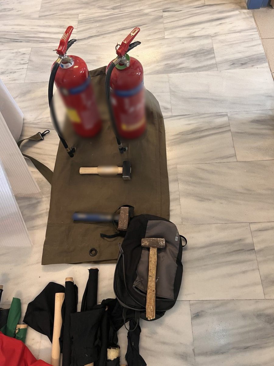 Από τις επακόλουθες έρευνες σε οικίες εντοπίστηκε και συνελήφθη και ο έκτος κατηγορούμενος, στην κατοχή του οποίου βρέθηκε ένα σφυρί σε σακίδιο πλάτης που έφερε.