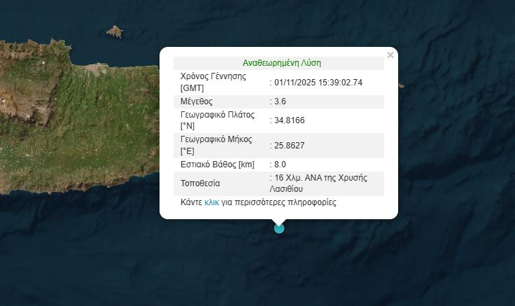 Σεισμός 3,6 βαθμών της κλίμακας Ρίχτερ σημειώθηκε το απόγευμα του Σαββάτου 1 Νοεμβρίου 2025 ανοιχτά της Κρήτης.