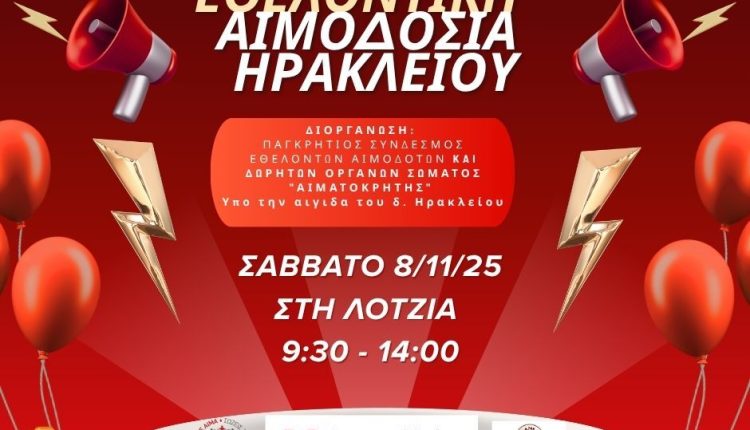 Το Σάββατο 8 Νοεμβρίου 2025 θα πραγματοποιηθεί εθελοντική αιμοδοσία στο κέντρο της πόλης του Ηρακλείου και συγκεκριμένα στο αίθριο της Λότζια από τις 09:30 έως τις 14:00. Η συγκεκριμένη αιμοδοσία είναι «Φοιτητική Εθελοντική Αιμοδοσία», ανοιχτή για όλους τους πολίτες αλλά με ιδιαίτερη έμφαση στους φοιτητές και τους νέους της πόλης μας με ενημερωτικά περίπτερα για όσους έρχονται για πρώτη φορά.