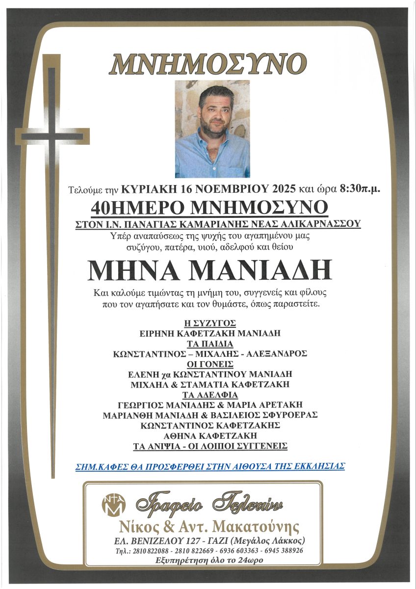 Την Κυριακή 16 Νοεμβρίου 2025 και ώρα 8,30 π.μ. θα τελεστεί το σαρανταήμερο μνημόσυνο του Μηνά Μανιαδή στον Ι.Ν. Παναγίας Καμαριανής στην Νέα Αλικαρνασσό.